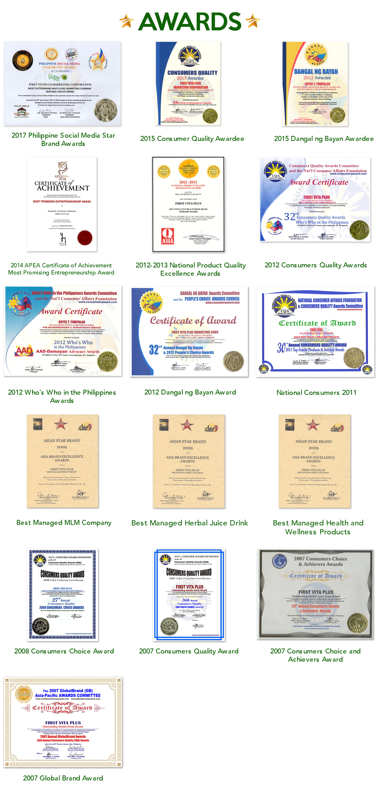 List of awards and certificates of First Vita Plus